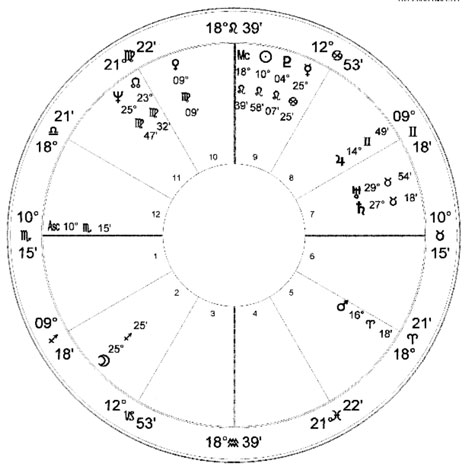 A Funnel Chart with the Moon as the spout, drawing the chart’s “energy” to the 2nd House (money) and the sign of Sagittarius (storytelling, publishing, higher education). The Singletons are Jupiter (“luck”) in Gemini (communications and information) in the 8th House (rehabilitation, transformation) and Mercury (communication) in the 9th House (publication, higher education). Notice how everything points in the same direction. Leo (show business) is the sign on the Mid-Heaven (career) and the ruler, the Sun, is in the, you guessed it, the 9th House (higher education, publications). The only aspects to that Mid-Heaven are from Mars (energy) and Jupiter (“luck”). Mars also rules the 6th House (work) giving a lot of energy and it is in the 5th House (fun and games) showing that she likes what she does.