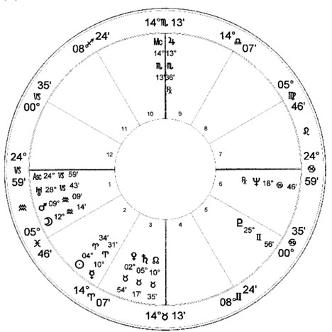 Pluto is Singleton. It is the only planet in a Mutable Sign and it channels “energy” to the 5th House (creativity) and the sign of Gemini (communications). Pluto is also the ruler of the sign at the Mid-Heaven (career). That sign is Scorpio (interest in psychology and the hidden, “underside” of things)This is a Funnel Chart with Jupiter (luck) as the spout planet drawing “energy” to the top of the chart (career and public image). This is another example of Jupiter aspects to the Mid-Heaven inclining to show business. The Moon (public) and Neptune (film) also aspect the Mid-Heaven. Uranus is right on the Rising Sign (independent, eccentric, maybe a genius or crazy).