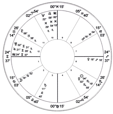 A Splash shaped horoscope. The planets are scattered all over the wheel and the distribution is pretty even. He was splashed all over the place too. President, soldier (that charge up San Juan hill), police commissioner (of New York City) explorer, adventurer, etc., etc. The time of his birth is in question, but that doesn’t affect the sign positions of the planets.